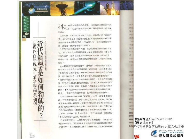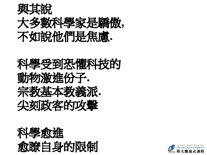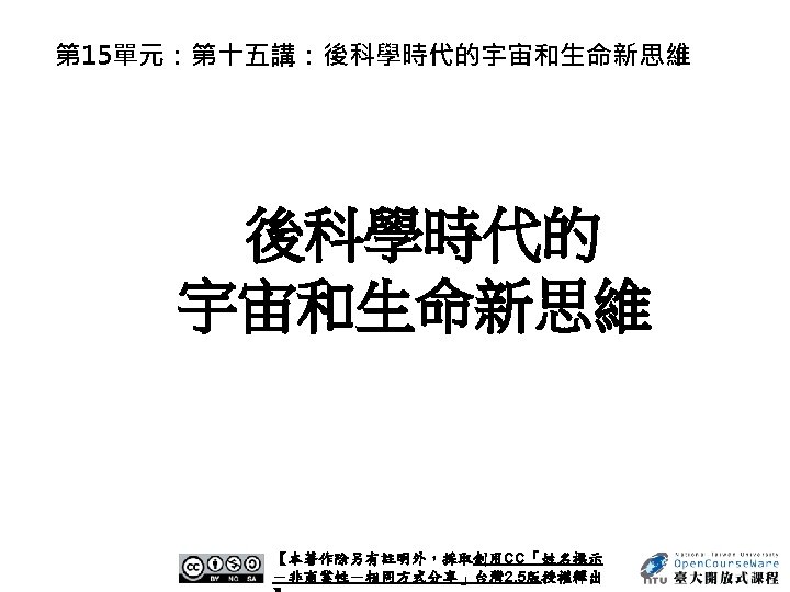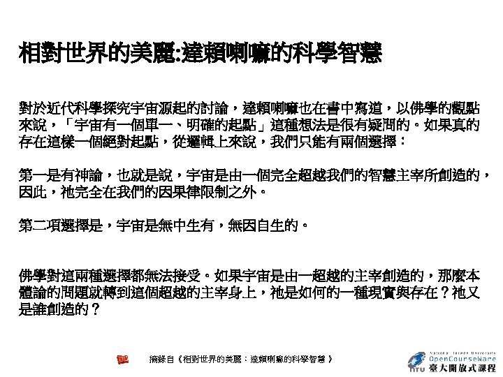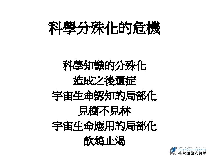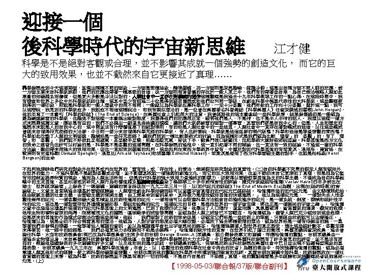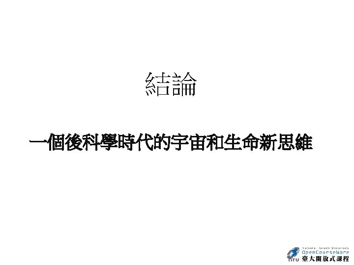 Nature 440, 1132 -1136 (27 April 2006) | doi: 10. 1038/nature 04804 Is our Universe natural? Sean M. Carroll 1 1. Enrico Fermi Institute, Department of Physics and Kavli Institute for Cosmological Physics, University of Chicago, 5640 South Ellis Avenue, Chicago, Illinois 60637, USA. Email: carroll@theory. uchicago. edu Abstract It goes without saying that we are stuck with the Universe we have. Nevertheless, we would like to go beyond simply describing our observed Universe, and try to understand why it is that way rather than some other way. When considering both the state in which we find our current Universe, and the laws of physics it obeys, we discover features that seem remarkably unnatural to us. Physicists and cosmologists have been exploring increasingly ambitious ideas in an attempt to explain how surprising aspects of our Universe can arise from simple dynamical principles. 參考來源: http: //www. nature. com/nature/journal/v 440/n 7088/abs/nature 04804. html