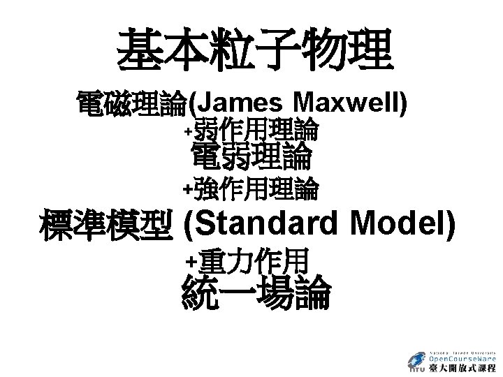 More Unified Theories • For years, physicists have sought for and found unified theories. • 1861 -1865 • James Maxwell, in a series of pages, described the interrelation of electric and magnetic fields thereby unifying them into electromagnetism. This led to the now-famous Maxwell's Equations. • 1881 -1884 • Hertz demonstrated radio waves and established that radio waves and light are electromagnetic waves of different frequencies, as predicted by Maxwell. 參考來源:http: //pdg. web. cern. ch/pdg/cpep/more_unified. html