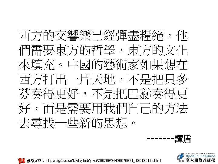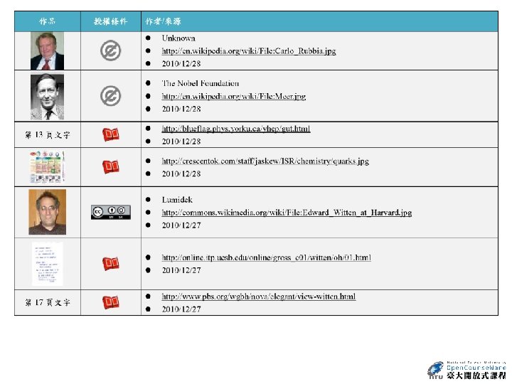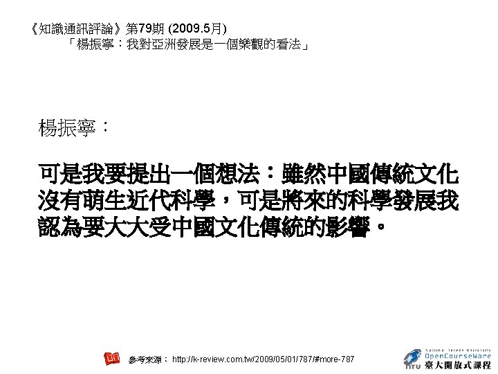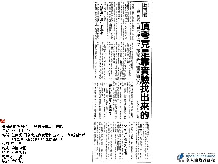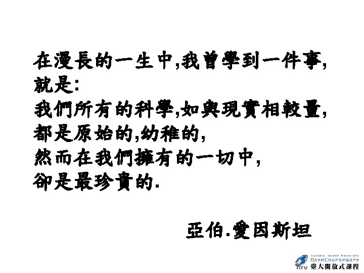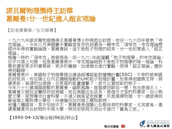 Essay Nature 438, 1085 (22 December 2005) Concept Unravelling string theory Edward Witten (Last two paragraphs) • But what is string theory? It may well be the only way to reconcile gravity and quantum mechanics, but what is the core idea behind it? Einstein understood the central concepts of general relativity years before he developed the detailed equations. By contrast, string theory has been discovered in bits and pieces — over a period that has stretched for nearly four decades — without anyone really understanding what is behind it. As a result, every bit that is unearthed comes as a surprise. We still don't know where all these ideas are coming from — or heading to. • One day we may understand what string theory really is. But even if we do, and theory is on the right track, will we be able to learn how it works in nature? I certainly hope so. Realistically, it all depends on many unknowns, including the nature of the answer, how clever we will be, and the clues we can get from experiment. 參考來源: http: //www. nature. com/nature/journal/v 438/n 7071/full/4381085 a. html