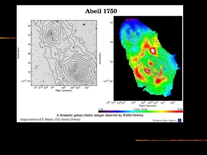 Cluster Abel 1644: si tratta di un cluster doppio. Nell'immagine a sinistra è mostrata l'emissione in banda X che evidenzia la presenza di una scia di gas freddo rilasciata dall'oggetto in alto a sinistra. Nell'immagine a destra è mostrata una simulazione idrodinamica del processo di stripping che può aver causato la perdita del gas.