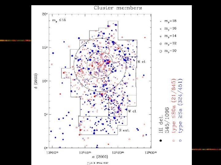 Cluster Type E S 0 Sp (E+S 0) /Sp Regular Cluster 35% 45% 20% 4. 0 Spiral Poor 20% 50% 30% 2. 3 Irregular (spiral Rich) 15% 35% 50% 1. 0 Field 10% 20% 70% 0. 5 Materia luminosa: Segregazione morfologica: come mostrato in tabella il rapporto E+S 0/Sp risulta essere 8 volte maggiore nei cluster regolari che per gli oggetti di campo. Moti delle galassie con velocità caratteristiche dell'ordine di 700800 km/s: dal Viriale si ottiene una stima della massa del cluster >> della massa luminosa DM Presenza di c. D galaxies: ellittiche dominanti che si pensa abbiano origine da merger di oggetti più piccoli.