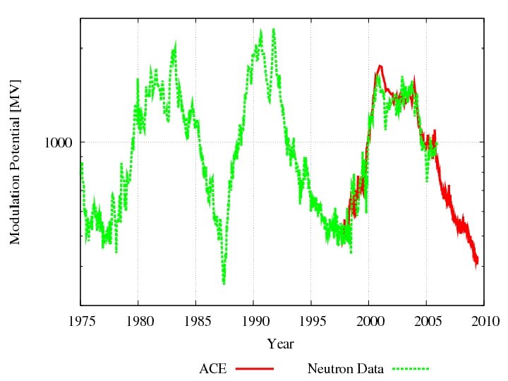 Modulation Potential • Modulation potential, Φ = |Z e|φ(r); barrier to penetrations of CRs • Integral in (1) extends from the inner boundary at radius r to the outer modulation boundary Rb, • Solar wind speed is V (x) and 1(x) is related to the radial diffusion coefficient, • based on fit to observed spectrum over time and species [O’Neil and Badhwar, 2006]: = 1(r) P β where P is the rigidity in GV, β is the particle speed over the speed of light, 1(r) 1 + (r/r 0)2 and r 0 = 4 AU • Reductions in modulation potential are caused by enhanced diffusion, allowing greater access and therefore higher fluxes of GCRs in the inner heliosphere
