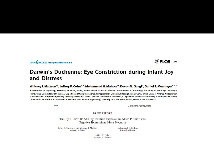 Darwin’s Duchenne (Mattson et al. , 2013) DISCUSSION ① During play, infant smiles are more emotionally positive than when trying to elicit a response from non-responsive parent ① When stymied by parent, infant cry-faces are more emotionally negative than cry-faces during play ① Duchenne marker (eye constriction) is associated with BOTH stronger smiles & stronger cry-faces