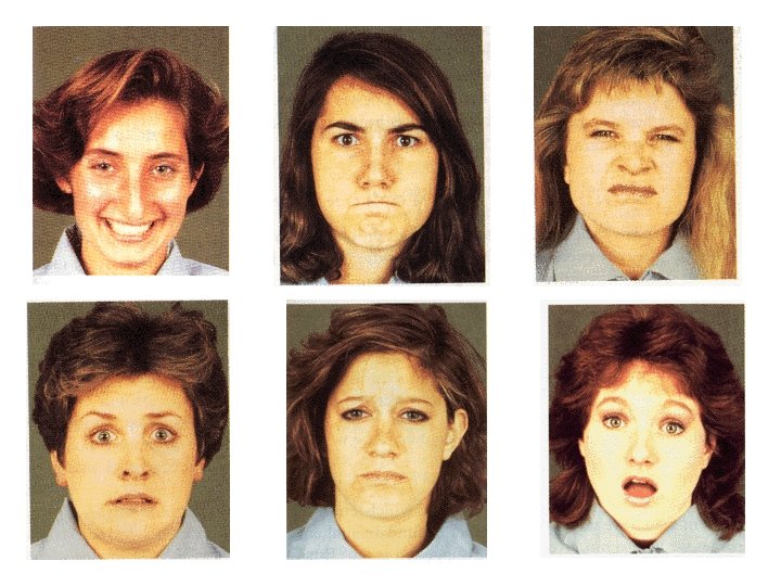The Face of Emotion Six basic facial expressions: anger, happiness, fear, surprise, disgust, and sadness. Recognized across cultures with high reliability. Consensus highest for happiness, lowest for fear. Some context dependence. Probably used for communication, both to others and to ourselves.