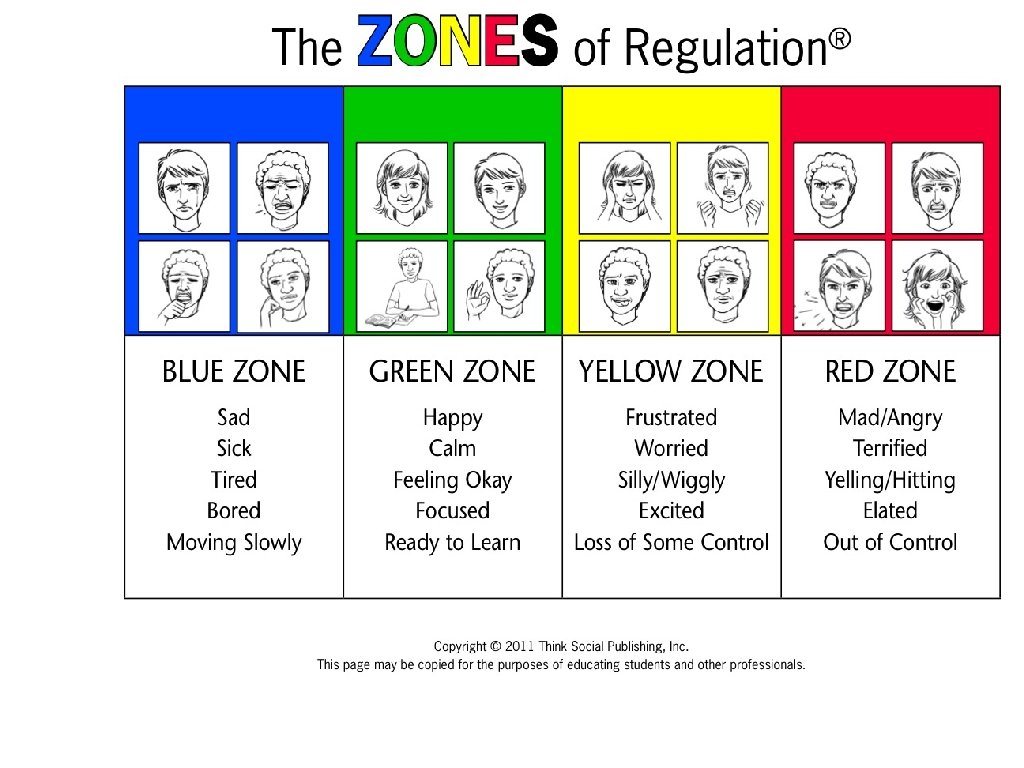 Emotional Modulation and Flexibility Any intense emotions (anger, fear, frustration, sadness, anxiety, excitement) make if difficult to establish and maintain optimal regulation • Learn to modulate/manage emotions skillfully: Use a regulation scale – feeling thermometer, zones of regulation, 5 point scale. • Develop a dimmer switch so we can go beyond black and white thinking and recognize graduation of emotions (anger, annoyance and frustration) • Match our affect to situations (Big Problem, Little Problem) • Getting "unstuck" from a specific emotion (Superflex and Rock Brain) • Evaluate, and modify the intensity of one's response; and when and how to express emotions • Teach that moods will pass as well as reset tools