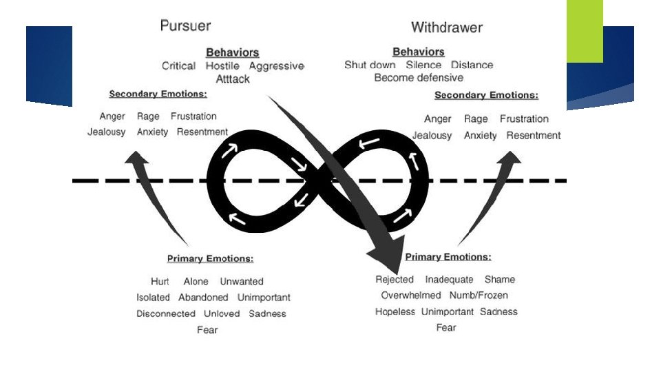 Focus on Emotion organises attachment behaviours Orients and motivates us to respond to others and communicates our needs Organises the way self and the other are experienced in relationship. Emotional accessibility and responsiveness are the building blocks of secure bonds. Emotion occurs at two levels: Primary and Secondary Primary emotions are the deeper, more vulnerable emotions like sadness, fear, hurt and loneliness. Often the initial reactions. If expressed often draws partners closer. Secondary emotions are the more reactive emotions such as anger, resentment, jealousy and frustration. They occur as a reaction to primary emotions and tend to push partners away. Goal is often to expand the person’s awareness and expression of emotion from secondary emotions to primary emotions.