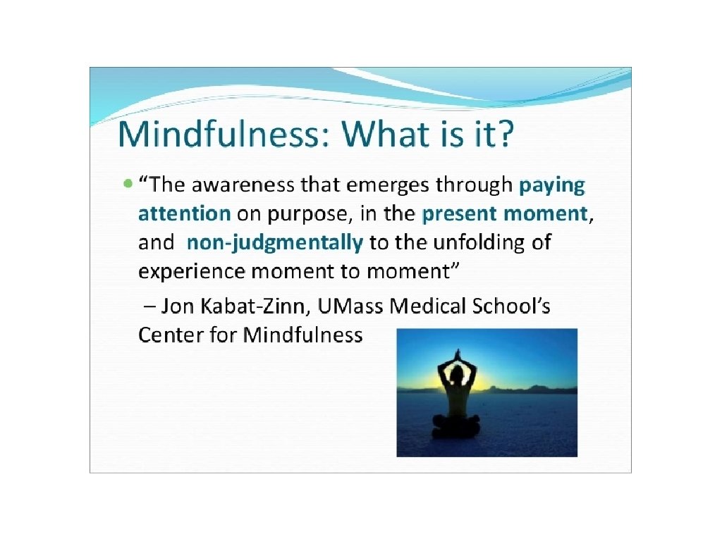Practical Practice • Start the day right-2 minute breath awareness • Take 10 minutes prior to walking on campus • Start with 2 Minutes quiet time at beginning of meetings and end 5 minutes early. • On your commute home-10 minutes no phone or radio-just be. Let go of any thoughts that arise. Attend to your breath