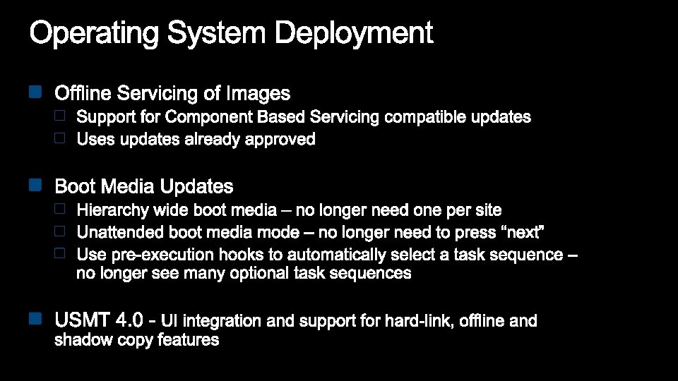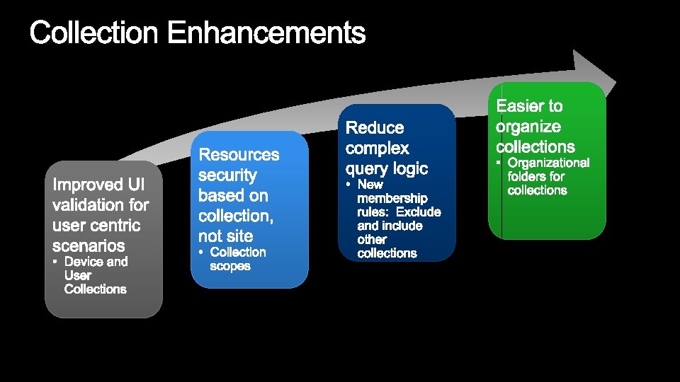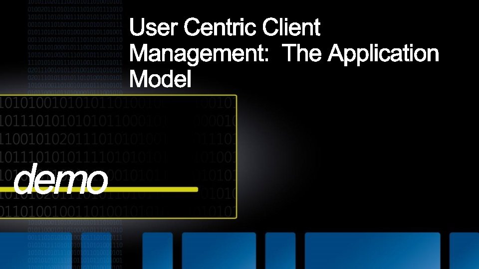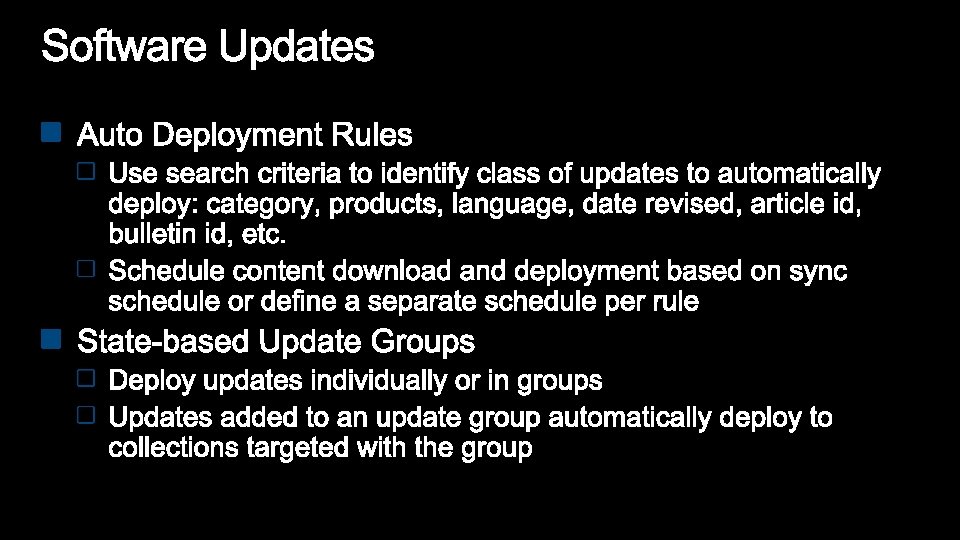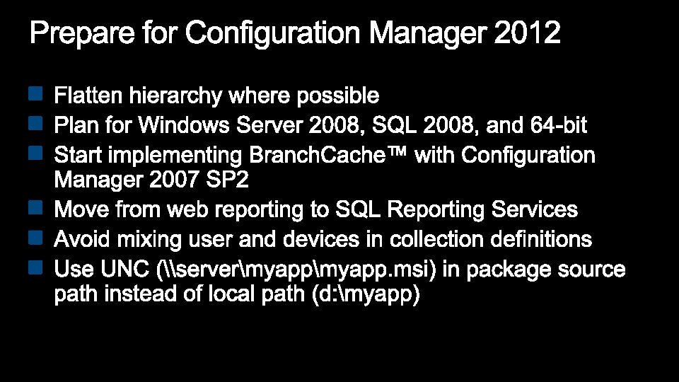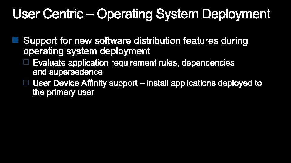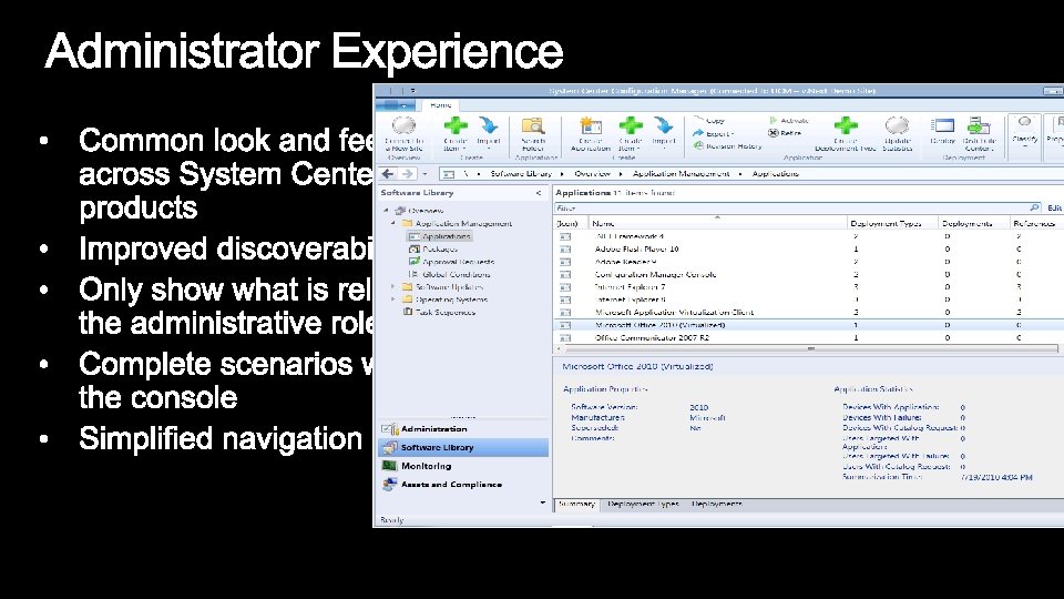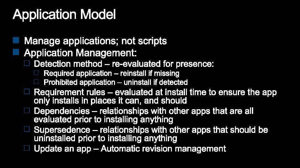 Configuration Manager 2007 Configuration Manager 2012 Optimized for Systems Management scenarios • Still committed and focused on System Management scenarios • Challenging to manage users: • Forced to translate a user to a device • Explicit: run a specific program on a specific device • Embrace User Centric scenarios: • Moving to a state based design, for apps, deployments, content on DPs. • Full application lifecycle model. Install, Revision Mgt, Supersedence and Uninstall • Software Distribution is a glorified script execution • Understand intelligently target the relationships between user systems Management solution tailored for applications •