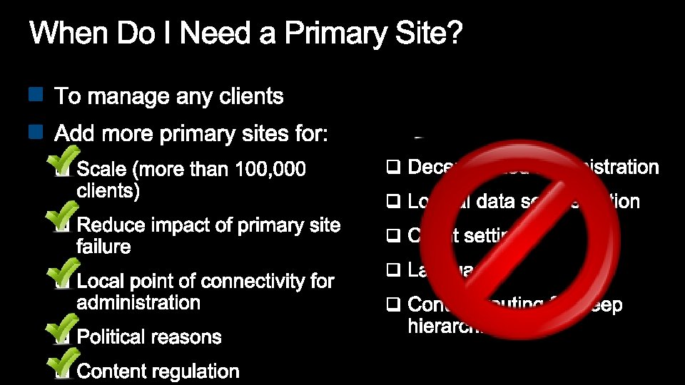 Unique Config. Mgr 2007 Primary Site for: Config. Mgr 2012 solutions (no unique primary sites): Decentralized administration Role Based Administration Logical data segmentation Role Based Administration Client settings for the hierarchy and unique collections Language packs Content routing for deep hierarchies Secondary Sites or Distribution Points