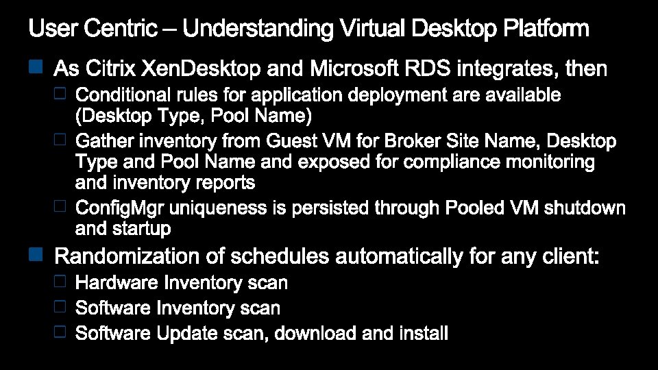 User preferences to control Config. Mgr behaviors: “My business hours” – used to control when to install software Presentation mode – don’t notify when presenting Remote control settings – when allowed, end user can control their experience