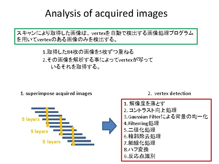 2. Relation between Scanning time and difference in Z-coordinate in which image is acquired Dz[μm] 1[sec](2[sec/set]) 2[sec](4[sec/set]) 3[sec](6[sec/set]) 4 sec(8 sec/set) Z[μm] Mean: 9. 8[μm] Mean: 5. 0[μm] Mean: 3. 3[μm] Mean: 3. 0[μm] Dz[μm] ・Scanning time が変化するとdzも変化する ・Scanning time=3 sec の時が一番規定値に近い