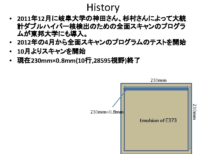 Emulsion general Scan in Toho Area: 230× 0. 8 mm 2 ・ 10 lines ・ 18926 sets Film: Emulsion of E 373 ・Module number: 87 ・Plate number: 10 Emulsion of E 373 230 mm× 0. 8 mm