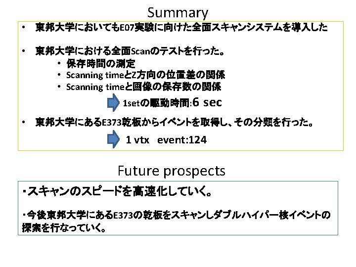 Short Summary -Scanning time. Ideal Saving time = 0. 7 sec Scanning time ≈ 0. 7 sec(1. 5[sec/set]) しかし、 現状ではScanning time = 1 secでは画像を取得する枚数が少ない。 Scanning time = 3 sec(6[sec/set]) が安定なので、この時間でScan Gifu University: 2[sec/set] 今後Scanning time = 0. 7 sec(1. 4[sec/set]) でScanできるように改善を試みていく。