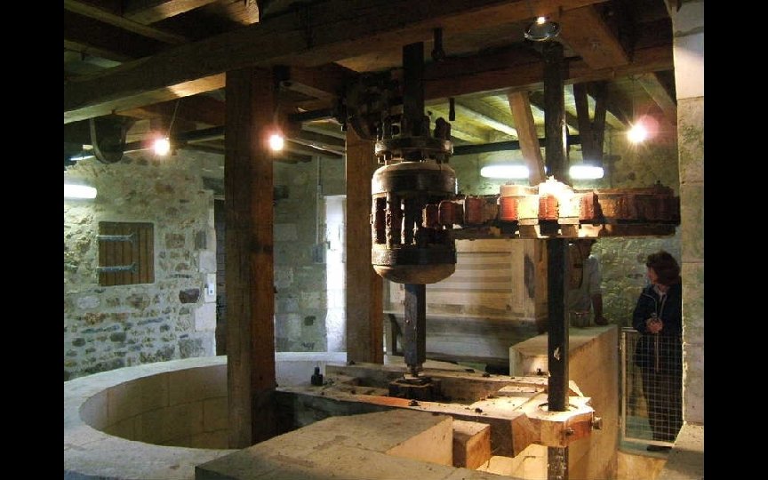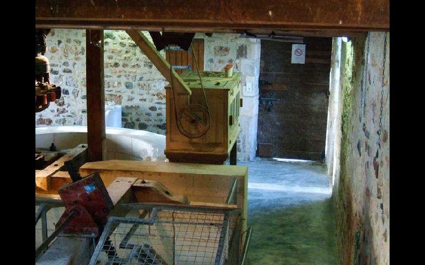 Au premier plan l’axe entraînant la meule située à l’étage et ici la fosse pour dans laquelle le meunier ajuste l’écartement des deux meules en soulevant ou abaissant cet axe.