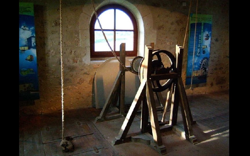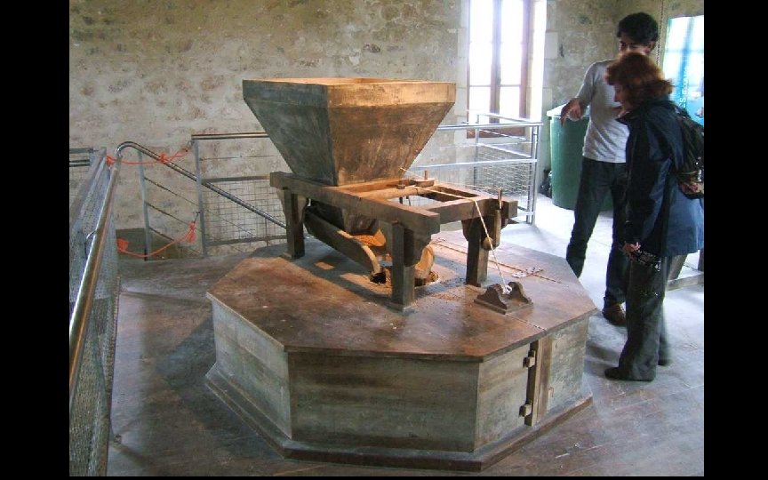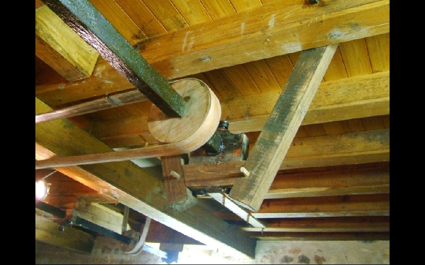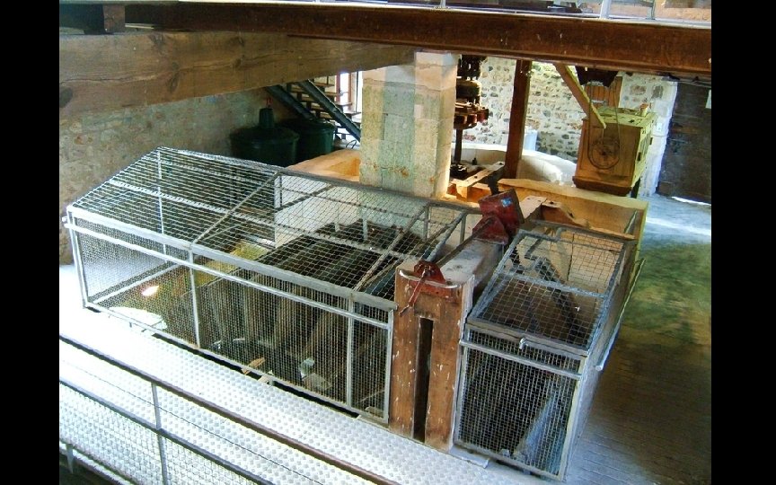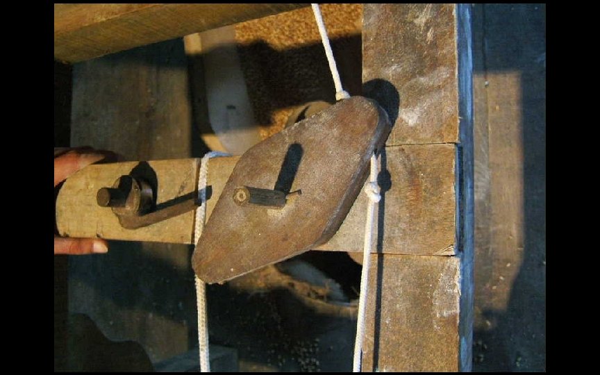 La corde de droite est le dispositif d’alarme de niveau bas dans la trémie et réveille le meunier pour qu’il recharge en grains