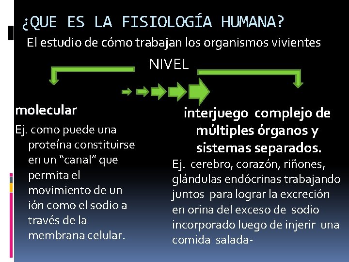 ¿QUE ES LA FISIOLOGÍA HUMANA? El estudio de cómo trabajan los organismos vivientes NIVEL molecular Ej. como puede una proteína constituirse en un “canal” que permita el movimiento de un ión como el sodio a través de la membrana celular. interjuego complejo de múltiples órganos y sistemas separados. Ej. cerebro, corazón, riñones, glándulas endócrinas trabajando juntos para lograr la excreción en orina del exceso de sodio incorporado luego de injerir una comida salada-