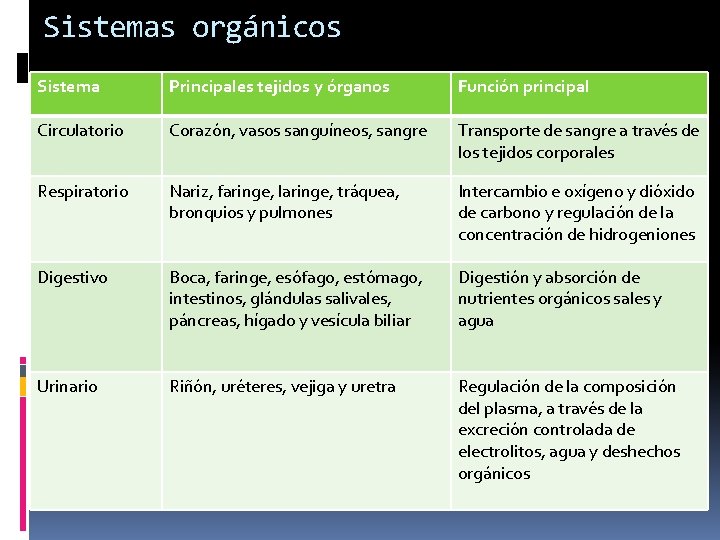 Sistemas orgánicos Sistema Principales tejidos y órganos Función principal Circulatorio Corazón, vasos sanguíneos, sangre Transporte de sangre a través de los tejidos corporales Respiratorio Nariz, faringe, laringe, tráquea, bronquios y pulmones Intercambio e oxígeno y dióxido de carbono y regulación de la concentración de hidrogeniones Digestivo Boca, faringe, esófago, estómago, intestinos, glándulas salivales, páncreas, hígado y vesícula biliar Digestión y absorción de nutrientes orgánicos sales y agua Urinario Riñón, uréteres, vejiga y uretra Regulación de la composición del plasma, a través de la excreción controlada de electrolitos, agua y deshechos orgánicos