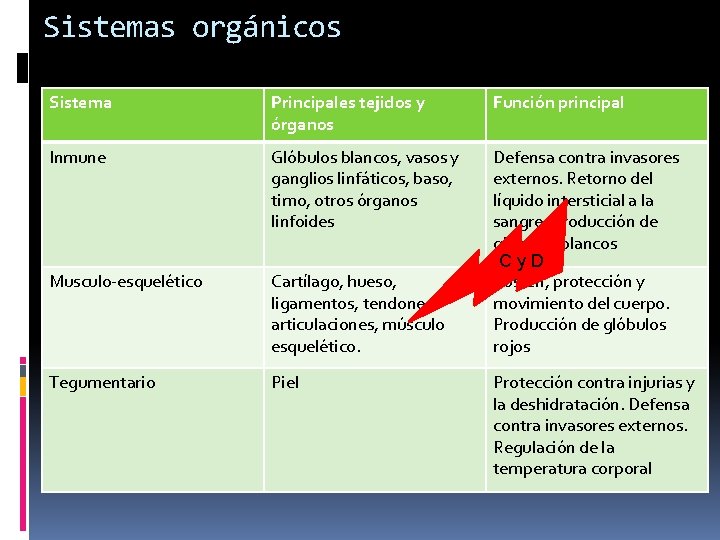 Sistemas orgánicos Sistema Principales tejidos y órganos Función principal Inmune Glóbulos blancos, vasos y ganglios linfáticos, baso, timo, otros órganos linfoides Musculo-esquelético Cartílago, hueso, ligamentos, tendones, articulaciones, músculo esquelético. Defensa contra invasores externos. Retorno del líquido intersticial a la sangre. Producción de glóbulos blancos Cy. D Sostén, protección y movimiento del cuerpo. Producción de glóbulos rojos Tegumentario Piel Protección contra injurias y la deshidratación. Defensa contra invasores externos. Regulación de la temperatura corporal