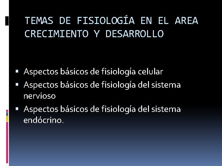 TEMAS DE FISIOLOGÍA EN EL AREA CRECIMIENTO Y DESARROLLO Aspectos básicos de fisiología celular Aspectos básicos de fisiología del sistema nervioso Aspectos básicos de fisiología del sistema endócrino.