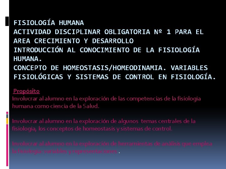 FISIOLOGÍA HUMANA ACTIVIDAD DISCIPLINAR OBLIGATORIA Nº 1 PARA EL AREA CRECIMIENTO Y DESARROLLO INTRODUCCIÓN AL CONOCIMIENTO DE LA FISIOLOGÍA HUMANA. CONCEPTO DE HOMEOSTASIS/HOMEODINAMIA. VARIABLES FISIOLÓGICAS Y SISTEMAS DE CONTROL EN FISIOLOGÍA. Propósito Involucrar al alumno en la exploración de las competencias de la fisiología humana como ciencia de la Salud. Involucrar al alumno en la exploración de algunos temas centrales de la fisiología, los conceptos de homeostasis y sistemas de control. Involucrar al alumno en la exploración de herramientas de análisis que emplea la fisiología: variables y representaciones.