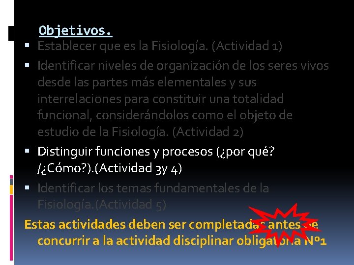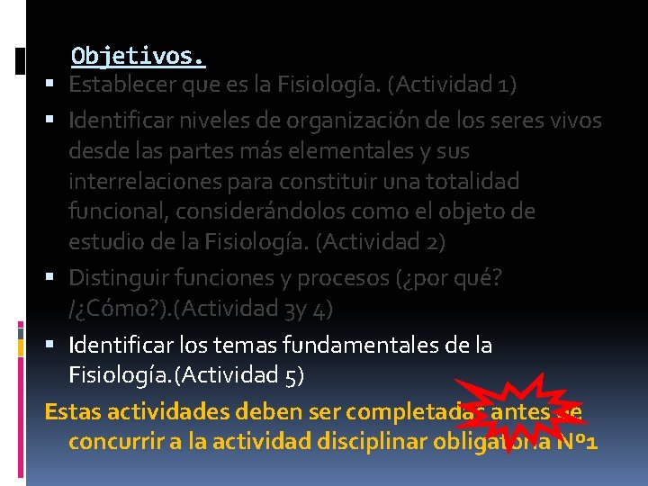 Objetivos. Establecer que es la Fisiología. (Actividad 1) Identificar niveles de organización de los seres vivos desde las partes más elementales y sus interrelaciones para constituir una totalidad funcional, considerándolos como el objeto de estudio de la Fisiología. (Actividad 2) Distinguir funciones y procesos (¿por qué? /¿Cómo? ). (Actividad 3 y 4) Identificar los temas fundamentales de la Fisiología. (Actividad 5) Estas actividades deben ser completadas antes de concurrir a la actividad disciplinar obligatoria Nº 1