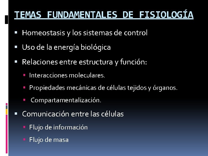TEMAS FUNDAMENTALES DE FISIOLOGÍA Homeostasis y los sistemas de control Uso de la energía biológica Relaciones entre estructura y función: Interacciones moleculares. Propiedades mecánicas de células tejidos y órganos. Compartamentalización. Comunicación entre las células Flujo de información Flujo de masa