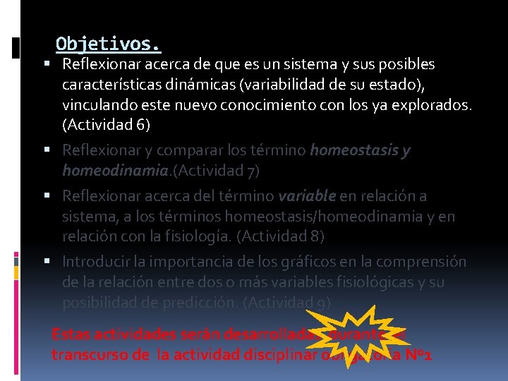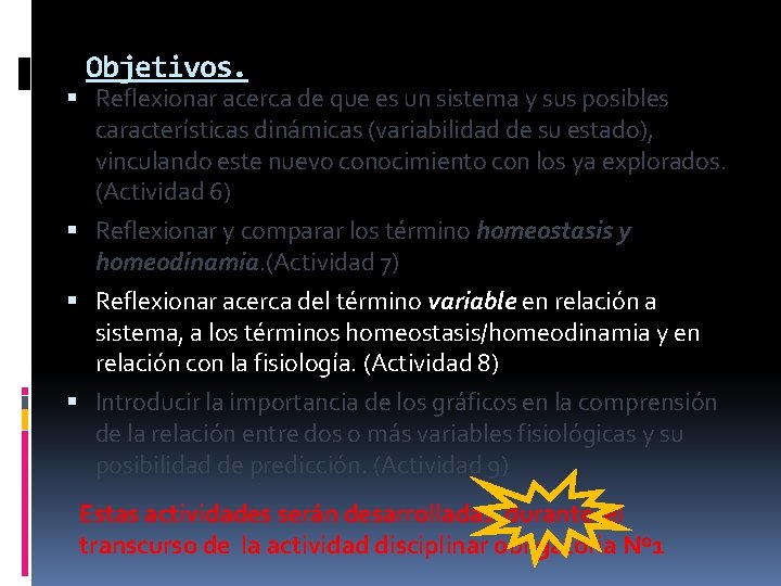Objetivos. Reflexionar acerca de que es un sistema y sus posibles características dinámicas (variabilidad de su estado), vinculando este nuevo conocimiento con los ya explorados. (Actividad 6) Reflexionar y comparar los término homeostasis y homeodinamia. (Actividad 7) Reflexionar acerca del término variable en relación a sistema, a los términos homeostasis/homeodinamia y en relación con la fisiología. (Actividad 8) Introducir la importancia de los gráficos en la comprensión de la relación entre dos o más variables fisiológicas y su posibilidad de predicción. (Actividad 9) Estas actividades serán desarrolladas durante el transcurso de la actividad disciplinar obligatoria Nº 1