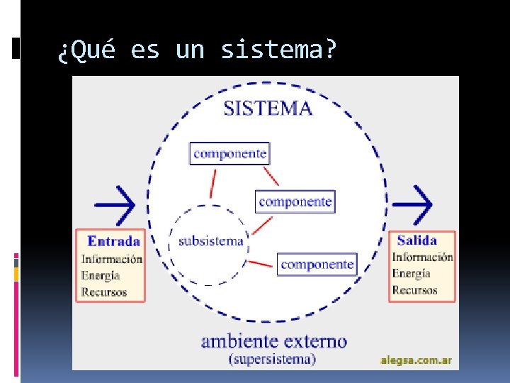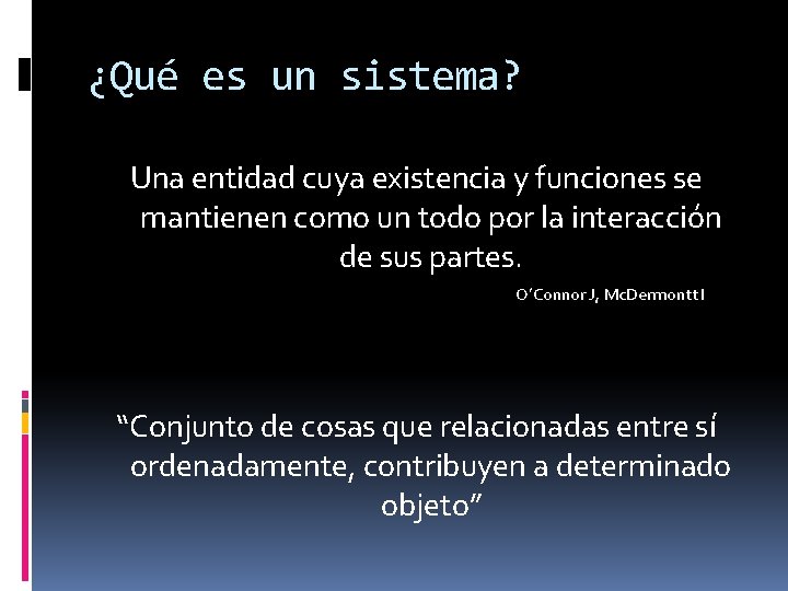 ¿Qué es un sistema? Una entidad cuya existencia y funciones se mantienen como un todo por la interacción de sus partes. O’Connor J, Mc. Dermontt I “Conjunto de cosas que relacionadas entre sí ordenadamente, contribuyen a determinado objeto”