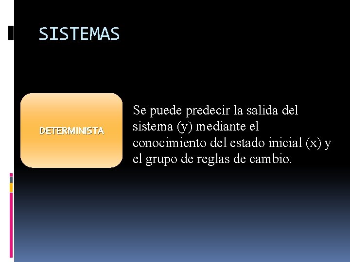 SISTEMAS DETERMINISTA Se puede predecir la salida del sistema (y) mediante el conocimiento del estado inicial (x) y el grupo de reglas de cambio.