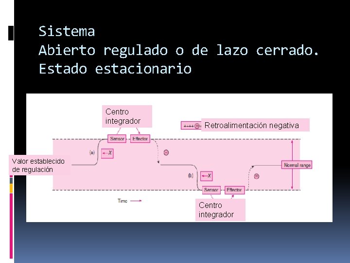 Sistema Abierto regulado o de lazo cerrado. Estado estacionario Centro integrador Retroalimentación negativa Valor establecido de regulación Centro integrador