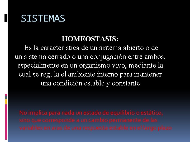 SISTEMAS HOMEOSTASIS: Es la característica de un sistema abierto o de un sistema cerrado o una conjugación entre ambos, especialmente en un organismo vivo, mediante la cual se regula el ambiente interno para mantener una condición estable y constante No implica para nada un estado de equilibrio o estático, sino que corresponde a un cambio permanente de las variables en aras de una respuestable en el largo plazo