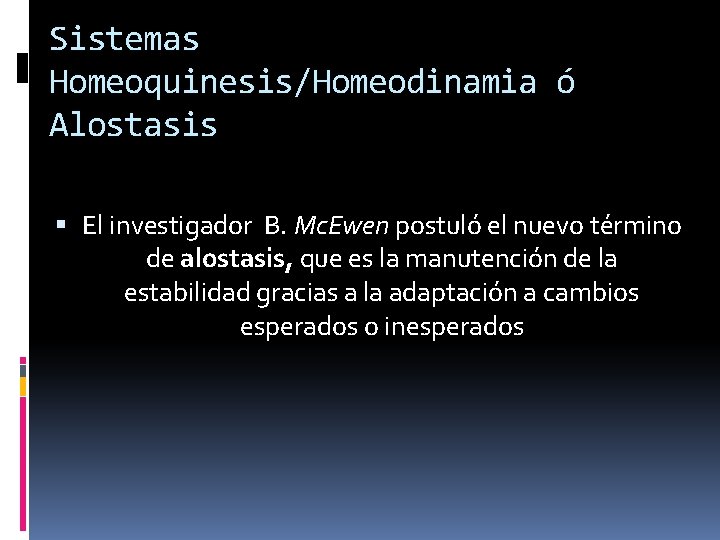 Sistemas Homeoquinesis/Homeodinamia ó Alostasis El investigador B. Mc. Ewen postuló el nuevo término de alostasis, que es la manutención de la estabilidad gracias a la adaptación a cambios esperados o inesperados
