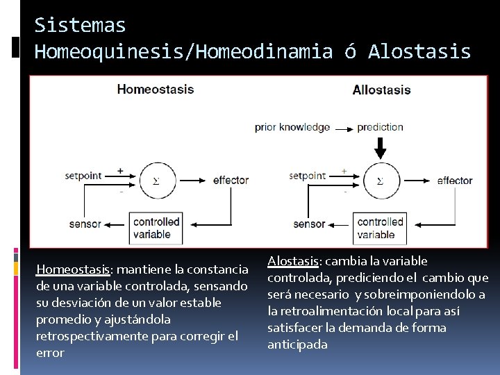 Sistemas Homeoquinesis/Homeodinamia ó Alostasis Homeostasis: mantiene la constancia de una variable controlada, sensando su desviación de un valor estable promedio y ajustándola retrospectivamente para corregir el error Alostasis: cambia la variable controlada, prediciendo el cambio que será necesario y sobreimponiendolo a la retroalimentación local para así satisfacer la demanda de forma anticipada