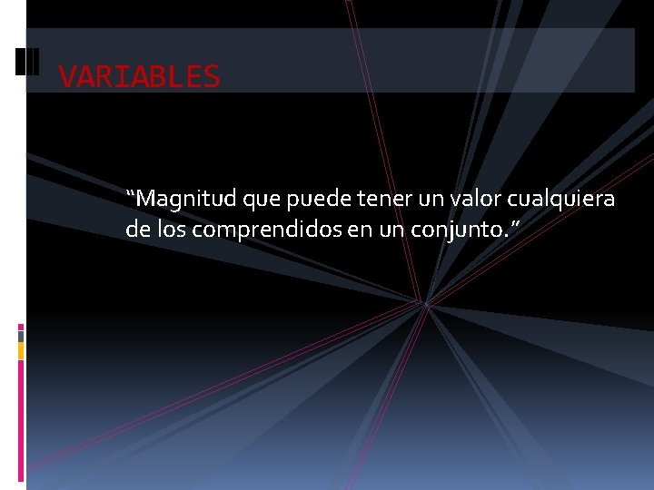 VARIABLES “Magnitud que puede tener un valor cualquiera de los comprendidos en un conjunto. ”