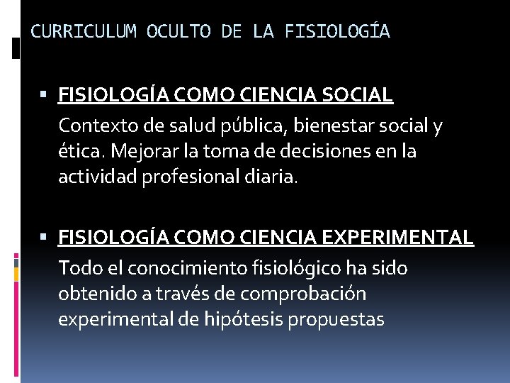 CURRICULUM OCULTO DE LA FISIOLOGÍA COMO CIENCIA SOCIAL Contexto de salud pública, bienestar social y ética. Mejorar la toma de decisiones en la actividad profesional diaria. FISIOLOGÍA COMO CIENCIA EXPERIMENTAL Todo el conocimiento fisiológico ha sido obtenido a través de comprobación experimental de hipótesis propuestas