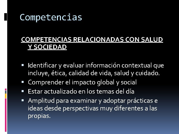 Competencias COMPETENCIAS RELACIONADAS CON SALUD Y SOCIEDAD Identificar y evaluar información contextual que incluye, ética, calidad de vida, salud y cuidado. Comprender el impacto global y social Estar actualizado en los temas del día Amplitud para examinar y adoptar prácticas e ideas desde perspectivas muy diferentes a las propias.