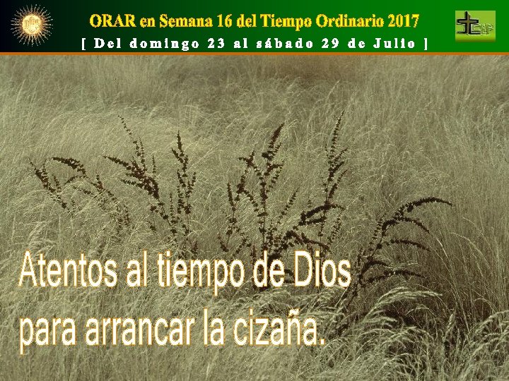 ¿Señor, quieres que vayamos a arrancar la cizaña? No la arranquen. En el tiempo de la cosecha Yo diré a los segadores: arranquen primero la cizaña y átenla para quemarla; Sólo es de Dios entrar en la y luego almacenen el trigo en mi granero. siembra que es la vida de las personas y acertar en el tiempo y en el modo de arrancar la cizaña; y sólo de nosotros, hacer caminos hasta el tiempo de la cosecha. Que la cizaña personal, social, política e institucional no nos paralice, sino que sepamos actuar con la misma sabiduría de Dios para erradicar lo que masacra la vida, sin perder la capacidad de seguir amando y sirviendo por encima de las [ ] dificultades, problemas o