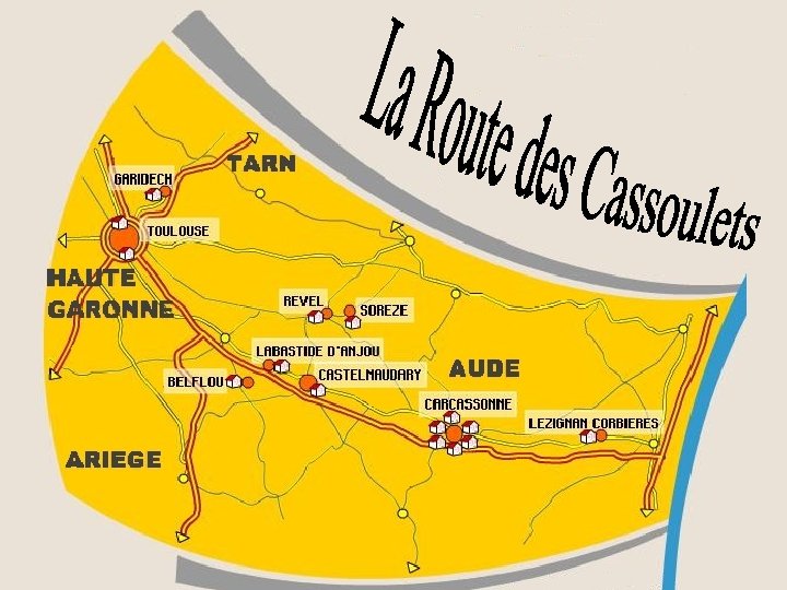 A la base traditionnelle du cassoulet de Castelnaudary : haricots lingots, confit, échine, poitrine, couennes, jarrets de porc, ail, bouquet garni, assaisonnements… …on ajoute de la perdrix rouge à Carcassonne. Dans la « Ville Rose » la viande est plutôt du mouton que du porc, on y joint du saucisson de couenne sans oublier les « saucisses de Toulouse » .