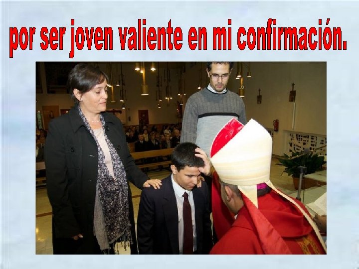 Y comienzan a pasar los que van a ser confirmados, uno por uno. El obispo, o su delegado, hace en la frente de cada uno la señal de la cruz, ungiéndole con el santo crisma, al mismo tiempo que le pone la mano sobre la cabeza. La señal de la cruz es la bandera que va a defender el nuevo soldado de Cristo.