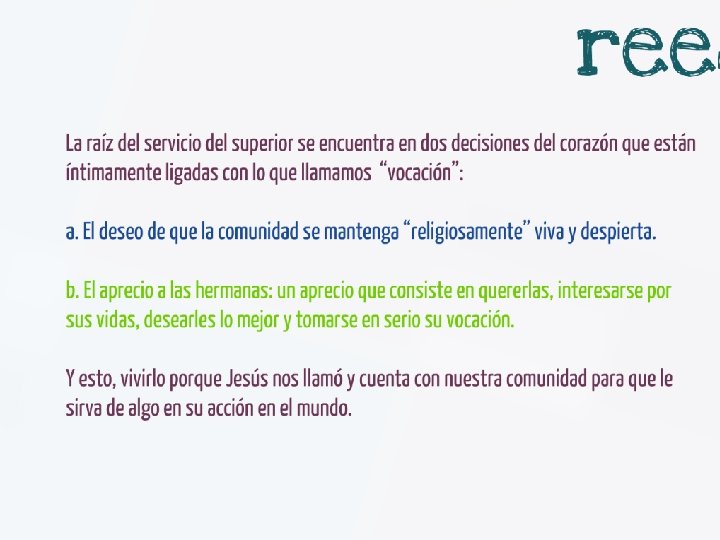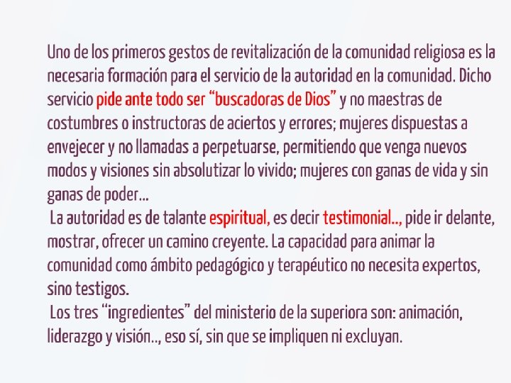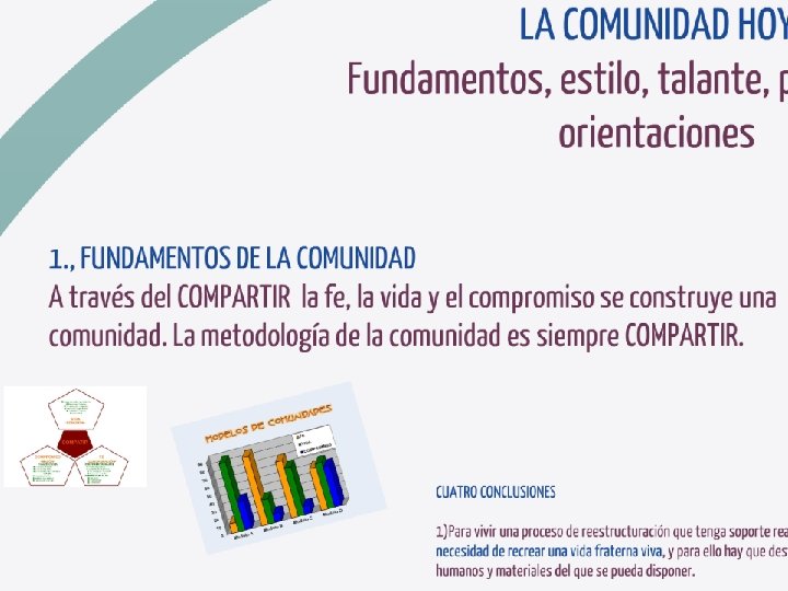 Retomar nuestra Identidad • La identidad es diferente de las funciones que ejercemos y de los trabajos que realizamos, aunque a través de ellos nos expresamos • Exige una reflexión profunda sobre el sentido de nuestra consagración a partir de la dimensión evangélica de nuestra vocación. • De aquí la centralidad de Dios en la existencia y en el proyecto personal de cada Consagrada y Consagrado
