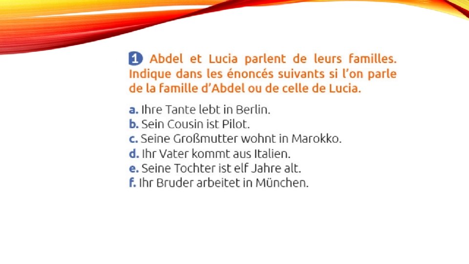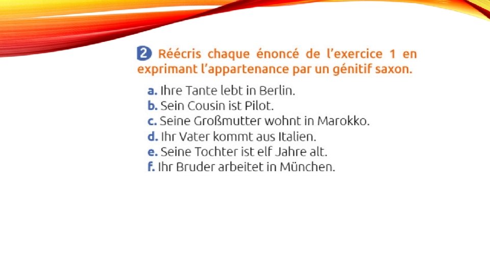 Bilan grammatical : Comment exprimer une appartenance : ü On peut utiliser un déterminant possessif : meinØ Vater deinØ Vater Jan seinØ Vater Julia ihrØ Vater ich du / meine Mutter / deine Mutter / seine Mutter / ihre Mutter ü Remarque : sein Vater ihr Vater his father