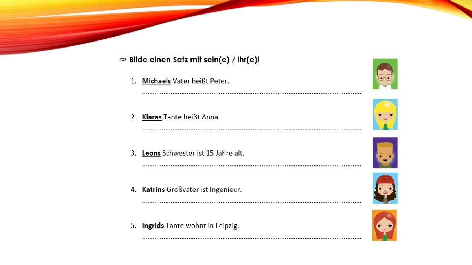 JULIA SCHNEIDER JAN BÖHM Ihre Familie wohnt in Leipzig. Seine Familie wohnt in Nürnberg. Ihr Bruder heißt Tim. Seine Schwester heißt Maja. Ihr Onkel heißt Philipp. Seine Großmutter heißt Sabine. Ihr Onkel ist Musiker und DJ. Sein Vater ist Illustrator.