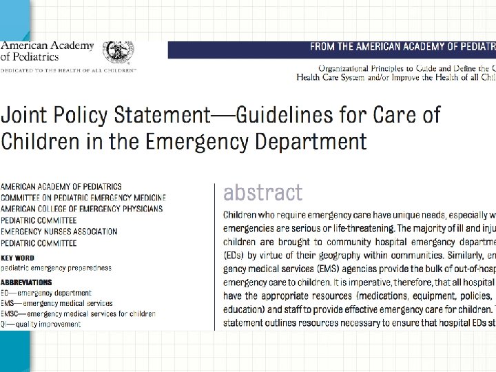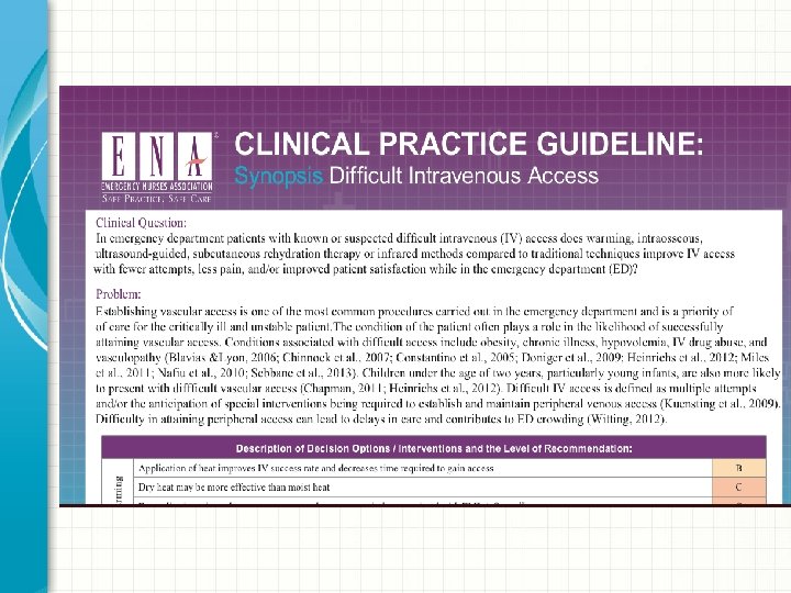 Clinical Practice Guidelines • Comprehensive and detailed information on a particular clinical or emergency care topic • Capnography during Procedural Sedation/ Analgesia Clinical Practice Guideline Synopsis • Prevention of Blood Specimen Hemolysis in Peripherally Collected Venous Specimens Clinical Practice Guideline Synopsis • Difficult Intravenous Access Clinical Practice Guideline Synopsis Family Presence During Invasive Procedures and Resuscitation • •