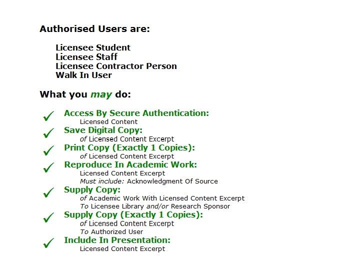 Licensing terms - the problem • Growth of digital collections in libraries • Need to automate electronic resource management • Variation in license terms • What are library users permitted to do? • Under what conditions? • Which classes of users are permitted to do what? • What exceptions are there to what they are permitted to do? • Licenses are, typically, negotiated then filed away • How can libraries and users know what rights have been negotiated and avoid saying “no” just in case?