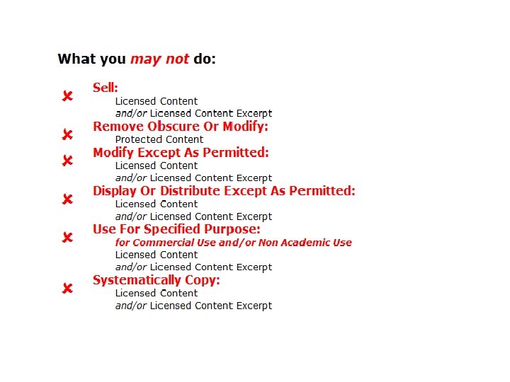 Not a “Technical Protection Measure” • Other standards (Xr. ML / ODRL) are designed to control rights “enforcement technologies” (i. e. technical protection) • They don’t have the flexibility we need • Libraries and publishers prefer to rely on compliance to licences • Our focus is entirely on the communication of usage terms (rights metadata), not technical protection • Library policies can over-ride message (e. g. fair use)