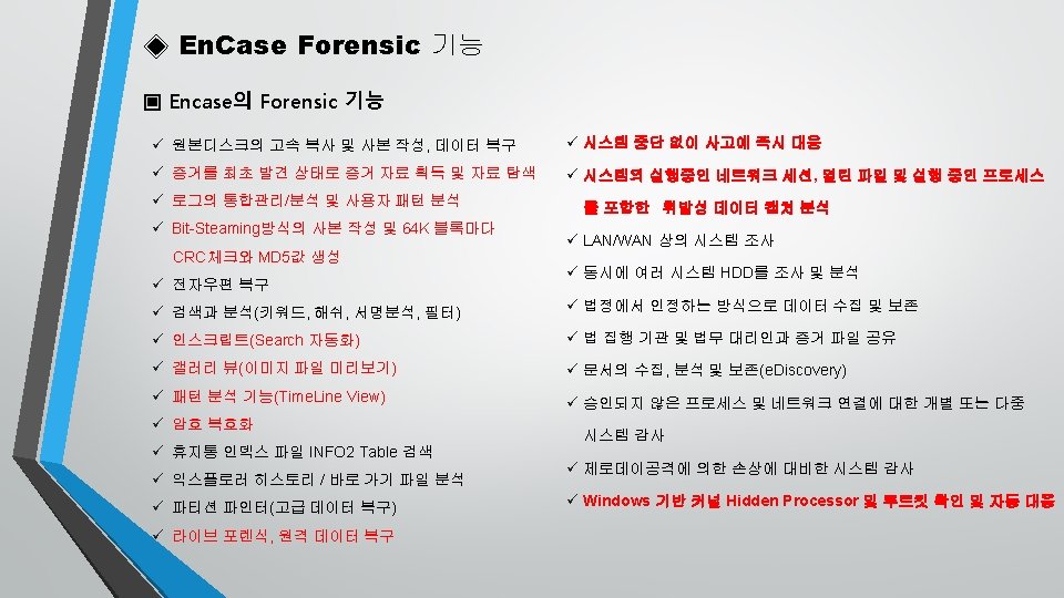 ◈ En. Case Forenisc 의 차별성 ▣ Encase Forensic 의 비교 Depth Of Analysis Encase ’ Products 일반적인 조사 툴 러닝 프로세스 탐지( Detect Running Processes ) O O 히든 프로세스 탐지( Detect Hidden Processes ) O X 리네임 프로세스 나 드라이버 탐지 ( Detect Renamed Processes or Dirvers) O X 러닝 서비스 탐지( Detect Running Services ) O O 악의적으로 삽입된 Dll’s 탐지( Detect Malicious Injected Dlls ) O X 루트키트 탐지( Detect Rootkits ) O X 현재 로근온 된 사용자 식별( Identify Current Logged-on User ) O O 자동실행된 레지스트리 키 열거( Enumerate Autostart Registry Keys) O X 히든 포트 탐지( Detect Hidden Ports ) O X 히든 레지스트리 키 나열( Identify Hidden Registry Keys) O X 상세한 리포팅 제공( Provide Detailed Reporting ) O X 머신 프로파일링( Machine Profiling ) O X