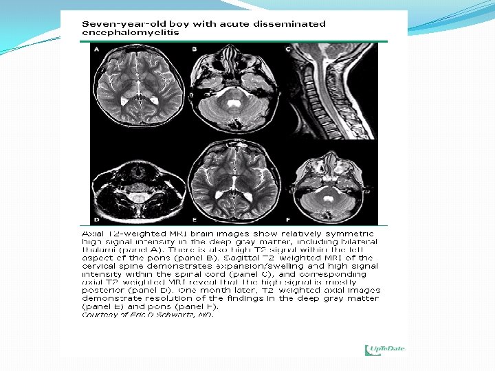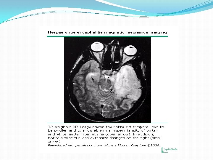 Presentación clínica � Los niños y adolescentes - En niños mayores y adolescentes, la encefalitis puede presentarse con fiebre, síntomas psiquiátricos, labilidad emocional, trastorno del movimiento, ataxia, convulsiones, estupor, letargo, coma o cambios neurológicos localizados (por ejemplo, hemiparesia, defectos de los nervios craneales, ataxia). � En una serie prospectiva de 50 niños (de 6 semanas a 18 años de edad) con encefalitis, las siguientes manifestaciones estuvieron presentes en el momento de la admisión: � Encefalopatía, que se define como el nivel deprimido o alterado de conciencia (incluyendo letargo, irritabilidad extrema cambio, importante en la personalidad o el comportamiento) que persiste durante ≥ 24 horas (100 por ciento) � Fiebre (80 por ciento) � Convulsiones (78 por ciento; 79 por ciento de ellos eran focal) � Signos neurológicos focales otro entonces convulsiones (56 por ciento) � Disminución de la conciencia (47 por ciento)