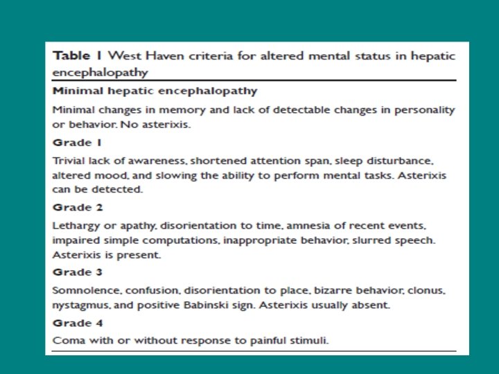 Encefalopatia hepatica minima Es una disfuncion cerebral leve que no puede ser detectada en la exploración clinica convencional, el diagnostico se puede establecer mediante pruebas neuropsicologicas o neurofisiologicas. • 2/3 en pacientes cirroticos • Evolucion hacia EH manifiesta • MC: daño a la percepcion visual y orientacion visuoespacial, procesos mentales lentos, perdida de memoria, hipoprosexia y disminucion de la concentracion. • Screening: de rutina vs actividad de riesgo. + se pueden recomendar disacaridos no absorbibles - Sin evidencia de que medidas de profilaxis disminuyan la progresion a EH manifiesta.