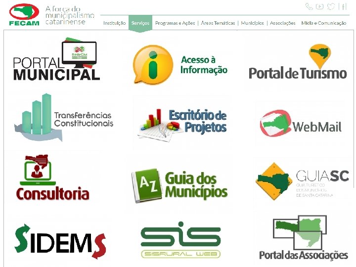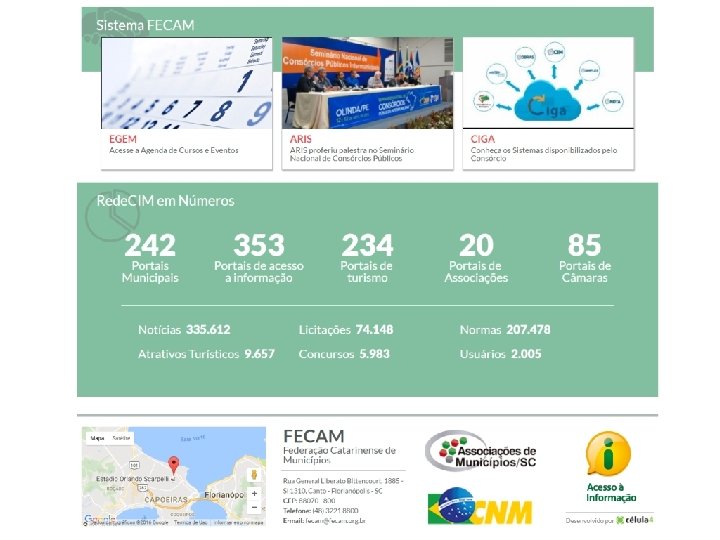 Santa Catarina possui 19 municípios na primeira posição da escala Brasil Transparente Ferramenta que permite ao Cidadão solicitar às informações públicas municipais, além de possibilitar a gestão das solicitações por parte do órgão público. 214 utilizam Portal FECAM 59 utilizam de Outros Fornecedores 22 Não Utilizam nenhum portal