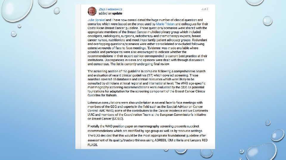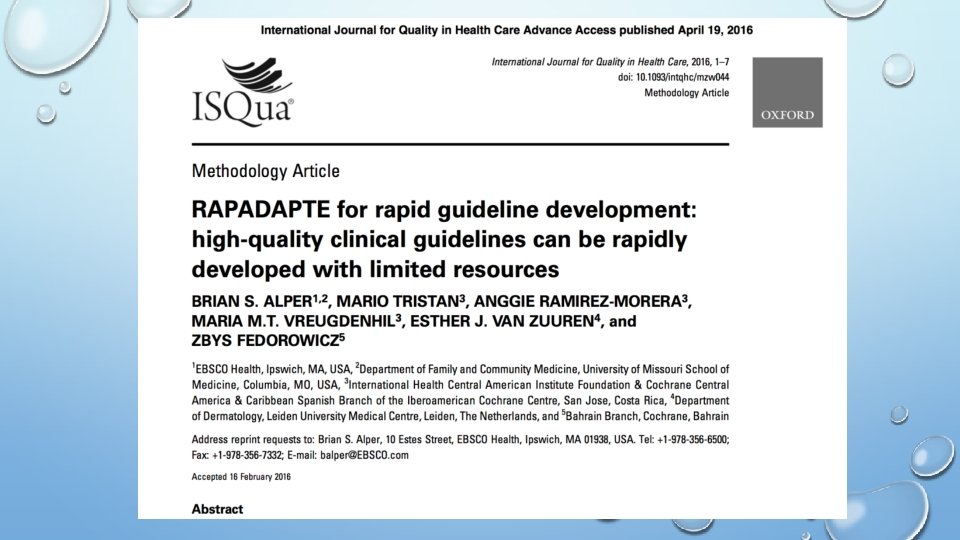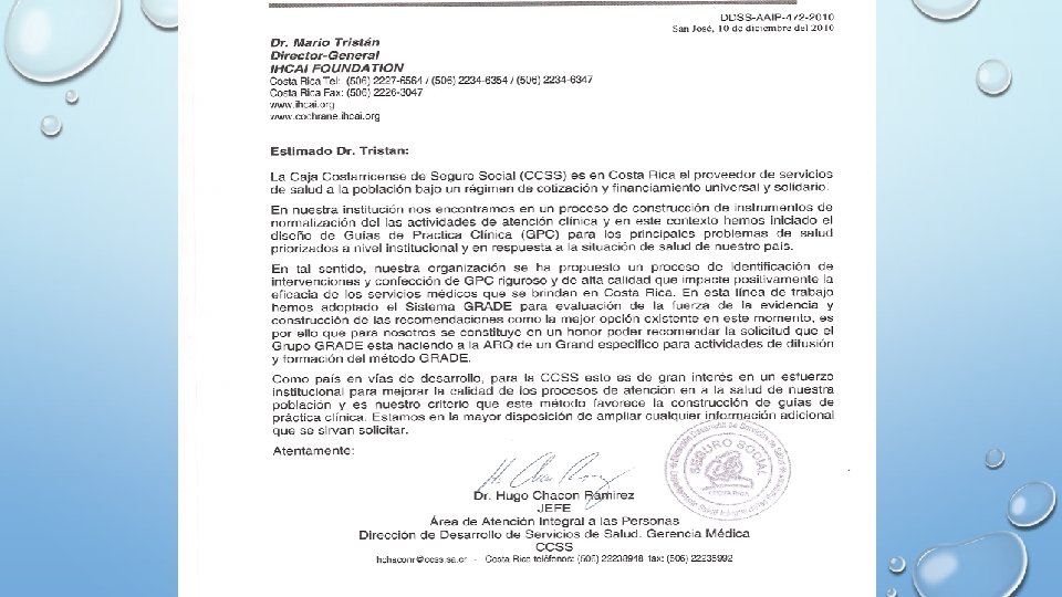 Elaboración/Adaptación de GPC • Un grupo de Costa Rica fue invitado a participar en la validación de la propuesta de adaptación de GPC Basado en la participación del proyecto de “ADAPTE Collaboration” lo que motivó al grupo al desarrollo de un método mas rápido y eficiente de desarrollo de GPC que cumpliera con las mejores especificaciones técnicas, redujera el tiempo de desarrollo y mantuvieras los costos de construcción dentro de un límite razonable. • Esto generó el método RAPADAPTE, que ha sido utilizado para el desarrollo en primer lugar de la GPC para el tratamiento de cáncer de mama en la CCSS y luego de las GPC para lesiones pre malignas de cuello de útero y parto pre término en Centroamérica por FECASOG (Federación de Asociaciones de Obstetricia y Ginecología de Centro América) y GPC Para el manejo ambulatorio (promoción, prevención, diagnóstico y tratamiento) del adulto con Diabetes Mellitus tipo 2 en OPS-Honduras y la GPC de Cáncer de mama en Bahrain (en desarrollo).